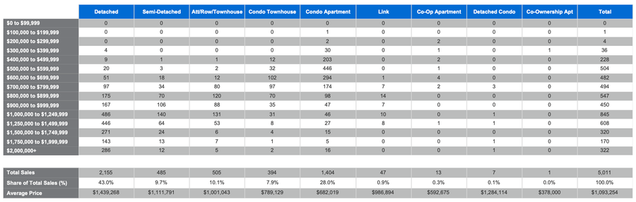 Theo Reddy-Choquette, "những ngôi nhà mới gia nhập thị trường trong khoảng giá một triệu đến một triệu rưỡi" đang bán rất tốt hiện nay - điều này cũng được phản ánh trong số liệu của TRREB. Những số liệu đó cho thấy có 845 giao dịch trong khoảng giá từ 1.000.000 đến 1.249.999 đô la và 608 giao dịch trong khoảng giá từ 1.250.000 đến 1.499.999 đô la.