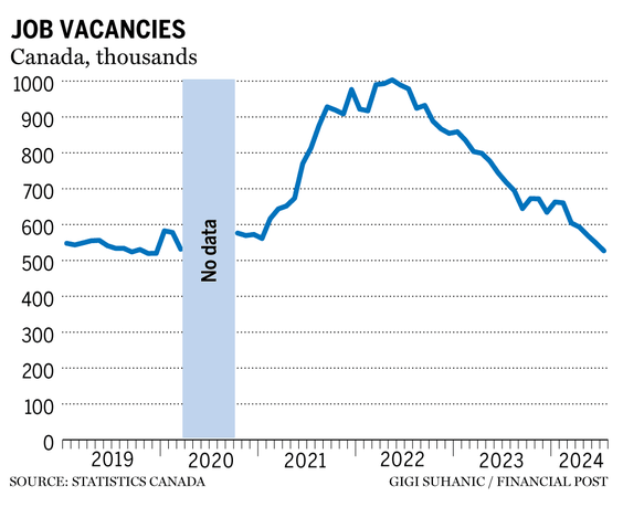 Dữ liệu việc làm còn trống từ Cơ quan Thống kê Canada đã củng cố bức tranh lao động đang chậm lại. Cơ quan này cho biết, việc làm còn trống đã giảm 4,1 phần trăm xuống còn 526.900 vào tháng 7, đây là mức giảm hàng tháng thứ ba liên tiếp và giảm gần một nửa so với mức đỉnh điểm đạt được vào tháng 5 năm 2022.