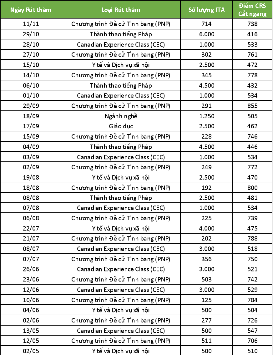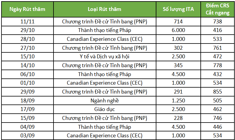 Đợt rút thăm ngày 11 tháng 11 diễn ra sau một chuỗi các đợt rút thăm gần đây: rút thăm Thành thạo tiếng Pháp vào ngày 29 tháng 10, rút thăm Canadian Experience Class (CEC) vào ngày 28 tháng 10, và rút thăm PNP vào ngày 27 tháng 10.