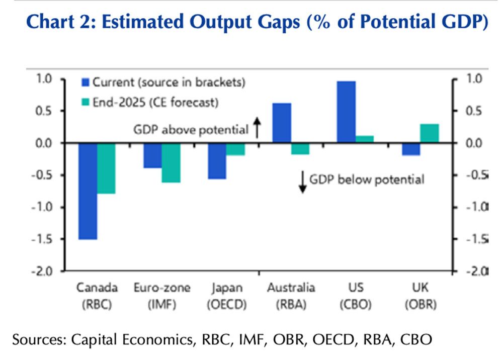Biểu đồ của Capital cho thấy nền kinh tế của Canada, khu vực đồng euro và Nhật Bản đang hoạt động dưới mức tiềm năng và họ kỳ vọng khoảng trống đầu ra âm sẽ tiếp tục đến năm 2025.