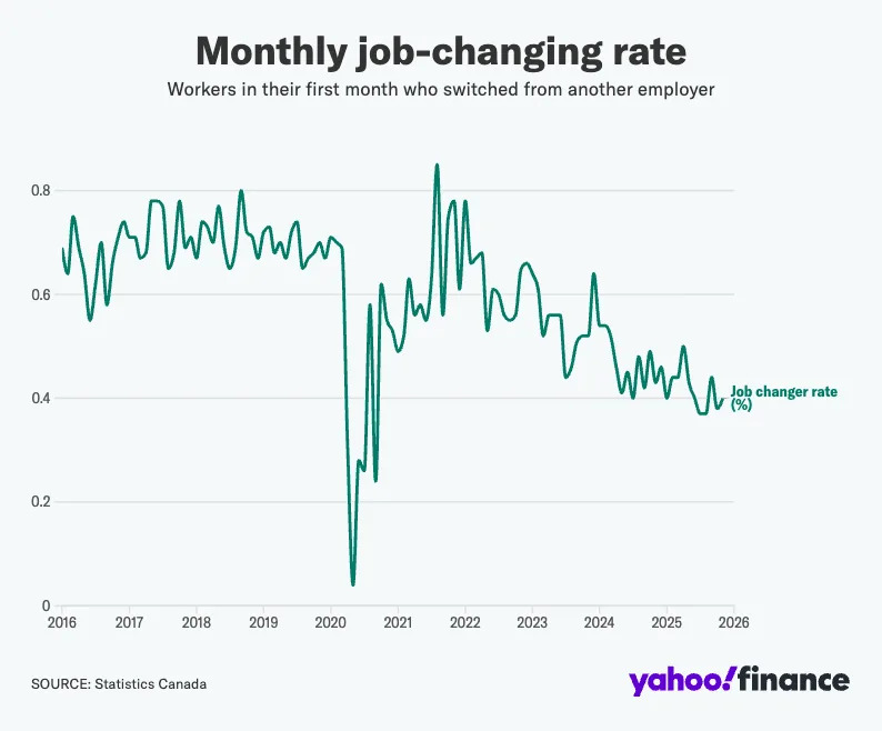 Tốc độ thay đổi công việc đã chậm lại trong những năm gần đây, dẫn đến việc ít người đảm nhận các vai trò mới hơn. Theo dữ liệu của Cơ quan Thống kê Canada, khoảng 4/1.000 người lao động thay đổi công việc mỗi tháng vào cuối năm 2025, giảm so với khoảng 7/1.000 trong những năm trước đại dịch.